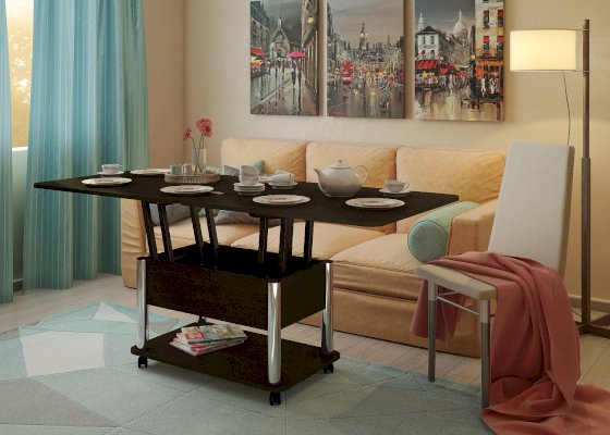 Стол-трансформер - очень удобная вещь для экономии пространства дома. Оборудован колесиками. Стол имеет механизм трансформации, обеспечивающий одновременное раскладывание большой (с откидной частью) и малой (поддерживающей) столешницы, что позволяет образовать два конечных положения: