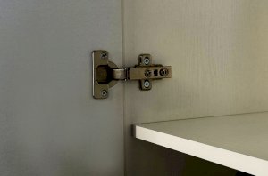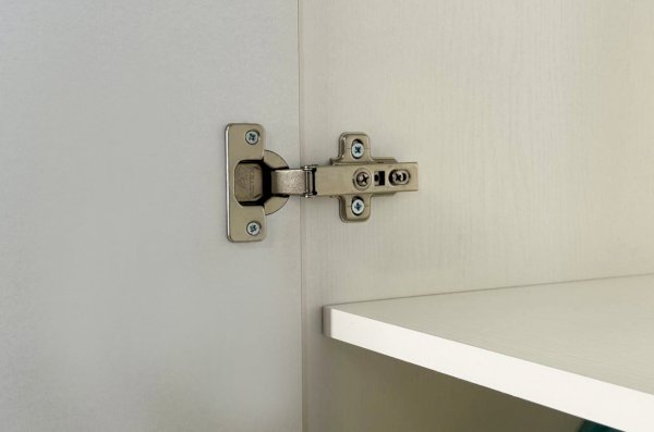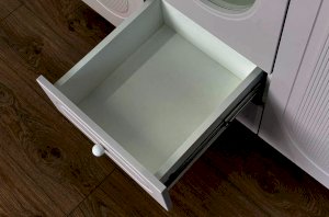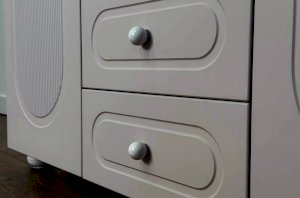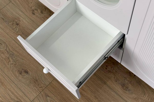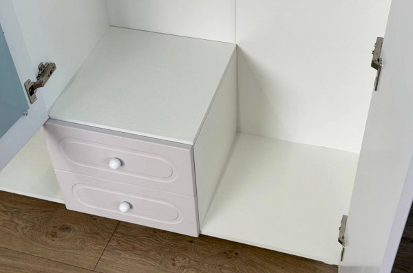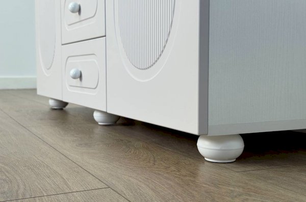 Корпус шкафа выполнен из ЛДСП толщиной 16 мм, фасады изготовлены из МДФ в плёнке ПВХ и декорированы фрезеровкой. Оригинальные круглые ручки и опоры подчёркивают стиль мебели и придают ей визуальную лёгкость.