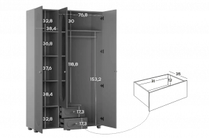 Шкаф оснащён тремя распашными дверями: две крайние двери выполнены из МДФ, а средняя дверь дополнена зеркалом, которое визуально расширяет пространство и делает комнату светлее. В нижней части предусмотрены два выкатных ящика, подходящих для хранения белья, аксессуаров или повседневных вещей.