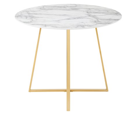 Лаконичный обеденный стол для кухни. Круглая столешница с рисунком белого мрамора выполнена из МДФ - прочного, экологически безопасного материала, который устойчив к перепадам температур и повышенной влажности. Поверхность столешницы декорирована рисунком белого мрамора, который идеально сочетается с металлическими ножками. Защитные подпятники на ножках предотвращают порчу напольного покрытия.